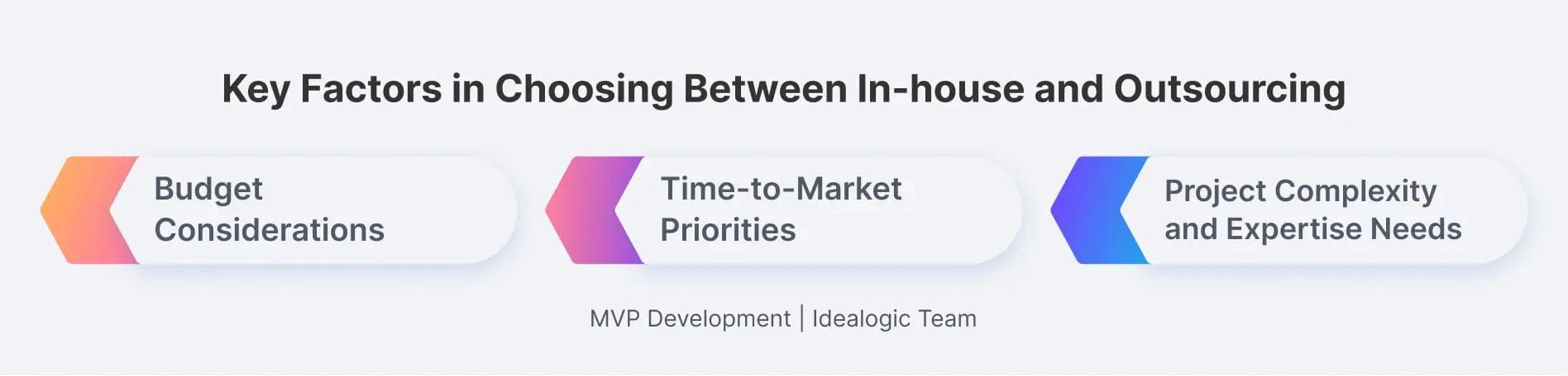 Choosing the appropriate development methods for an MVP necessitates that startups assess key elements like budget, schedule, and project difficulty. Comprehending how these factors impact the decision between internal development and outsourcing guarantees consistency with business objectives and resource allocation.